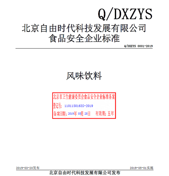 北京自由時代科技發展有限公司本次備案的企業標準《風味飲料》,經過我公司技術人員池建敏老師的編寫、備案,所提交的材料符合北京市衛健委的備案要求,于2019年05月成功備案并在北京市食品安全標準管理系統公示。