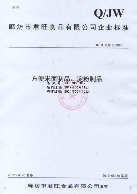 廊坊市君旺食品有限公司本次備案的企業(yè)標(biāo)準(zhǔn)《方便米面制品、淀粉制品》,經(jīng)過我公司技術(shù)人員黃占先老師的編寫、公示、備案,所提交的材料符合河北省衛(wèi)健委的備案要求,于2019年06月成功備案并在河北省衛(wèi)健委食品安全標(biāo)準(zhǔn)信息平臺公示。