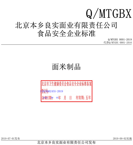 北京本鄉良實面業有限責任公司本次備案的企業標準《面米制品》,經過我公司技術人員朱麗真老師的編寫、備案,所提交的材料符合北京市衛健委的備案要求,于2019年08月成功備案并在北京市食品安全標準管理系統公示。
