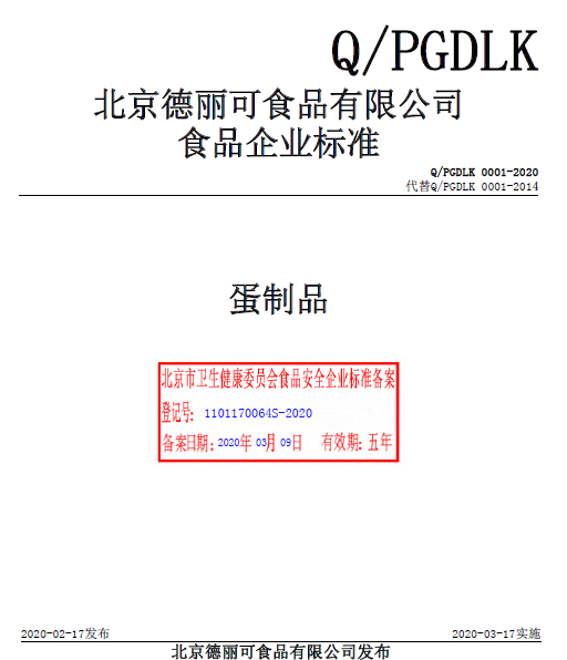 北京德麗可食品有限公司本次備案的企業(yè)標(biāo)準(zhǔn)《蛋制品》,經(jīng)過我公司技術(shù)人員朱麗真老師的編寫、備案,所提交的材料符合北京市衛(wèi)健委的備案要求,于2020年3月成功備案并在北京市食品安全標(biāo)準(zhǔn)管理系統(tǒng)公示。