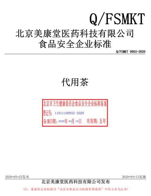 北京美康堂醫藥科技有限公司本次備案的企業標準《代用茶》,經過我公司技術人員黃占先老師的編寫、備案,所提交的材料符合北京市衛健委的備案要求,于2020年4月成功備案并在北京市食品安全標準管理系統公示。