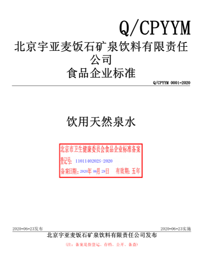 北京宇亞麥飯石礦泉飲料有限責任公司本次備案的企業標準《飲用天然泉水》,經過我公司技術人員黃占先老師的編寫、備案,所提交的材料符合北京市衛健委的備案要求,于2020年6月成功備案并在北京市食品安全標準管理系統公示。