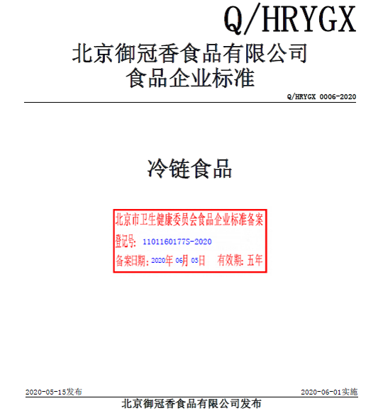 北京御冠香食品有限公司本次備案的企業(yè)標(biāo)準(zhǔn)《冷鏈?zhǔn)称贰罚?jīng)過我公司技術(shù)人員池建敏老師的編寫、備案,所提交的材料符合北京市衛(wèi)健委的備案要求,于2020年6月成功備案并在北京市食品安全標(biāo)準(zhǔn)管理系統(tǒng)公示。