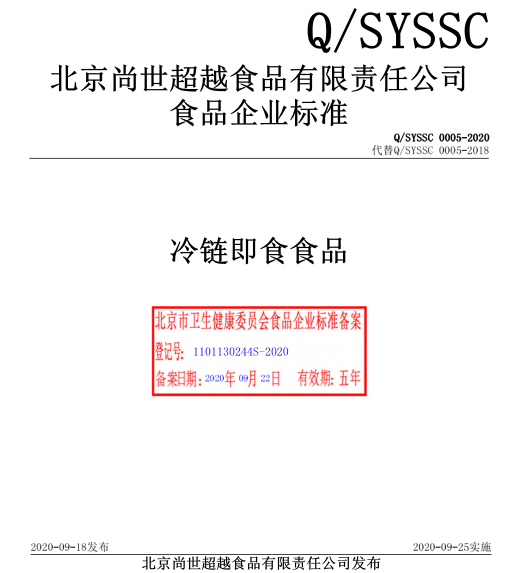 北京尚世超越食品有限責任公司本次備案的企業標準《冷鏈即食食品》,經過我公司技術人員黃占先老師的編寫、備案,所提交的材料符合北京市衛健委的備案要求,于2020年9月成功備案并在北京市食品安全標準管理系統公示。
