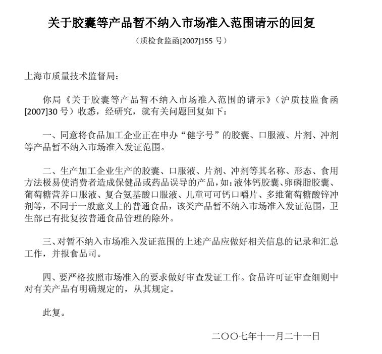 關于膠囊等產品暫不納入市場準入范圍請示的回復