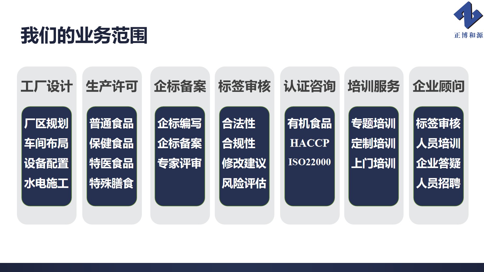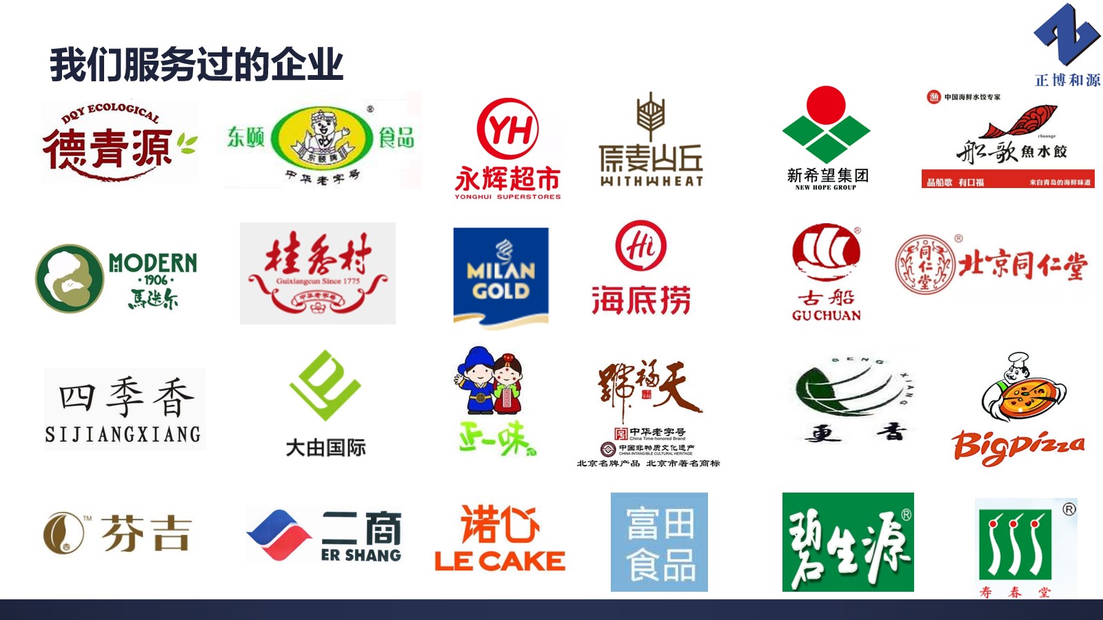 北京正博和源科技有限公司,成立于2009年,多年來,一直秉持“正本清源,博學(xué)致用”的發(fā)展理念,致力于為食品企業(yè)提供一站式專業(yè)技術(shù)服務(wù),已累計(jì)服務(wù)各類食品、餐飲、食品相關(guān)產(chǎn)品、政府部門企業(yè)數(shù)千家。
